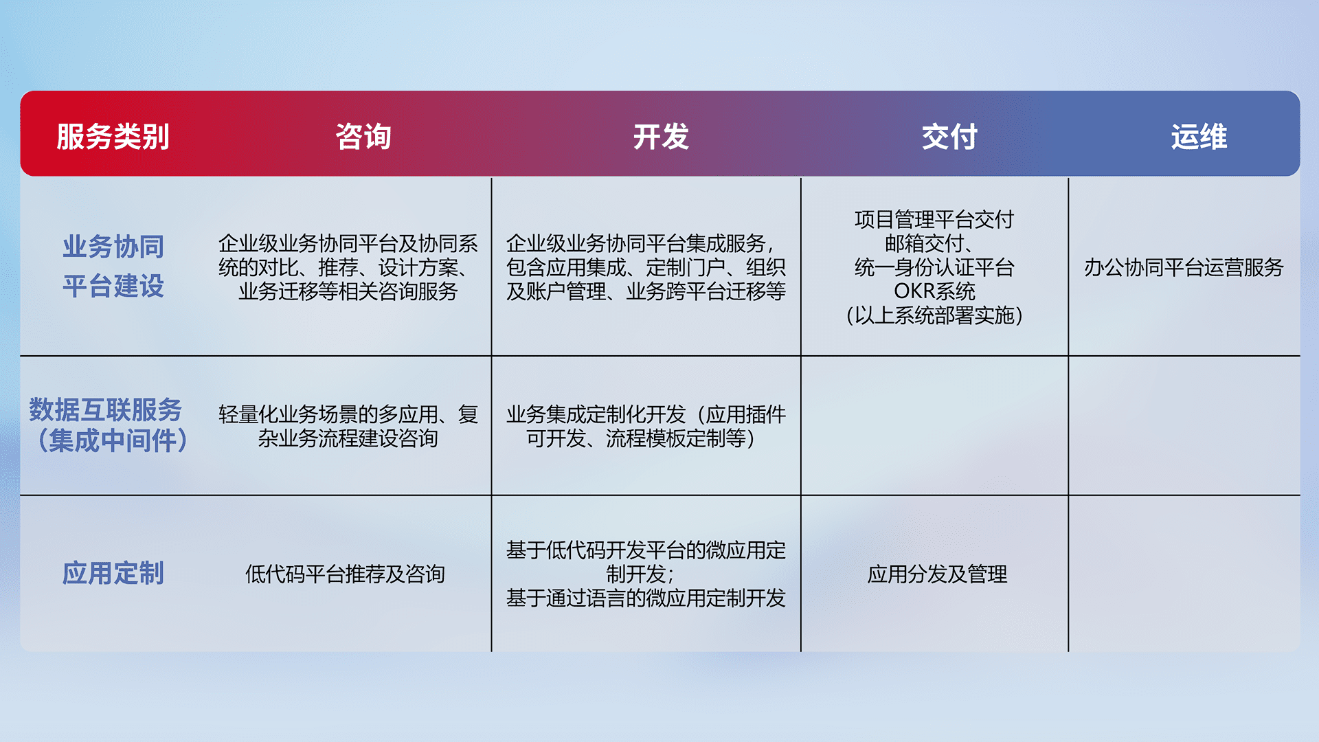 针对钉钉、、、、企微、、、IDaas等平台级产品提供产品的规划、、、方案、、、、交付、、定制化开发等服务,,实现如统一协同办公、、智能客户服务、、、混合会议管理、、、智能数据查询、、、等业务场景,,,实现数字化转型。。