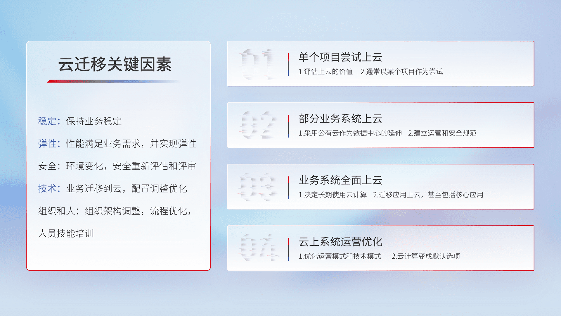结合实际业务,,,,从规划设计、、、、云平台选型、、云原生改造、、、、数据迁移、、、集成交付,,,,迁移全过程为客户识别最佳上云路径,,做好风险识别管理,,设计网络架构、、身份权限、、安全审计合规、、操作审计、、、日志审计、、、、监控告警策略、、多站点容灾设计等,,,对云上基础设施进行整体规划,,提升IT治理水平,,,以满足弹性、、、、高可用、、、、高性能的需求。。