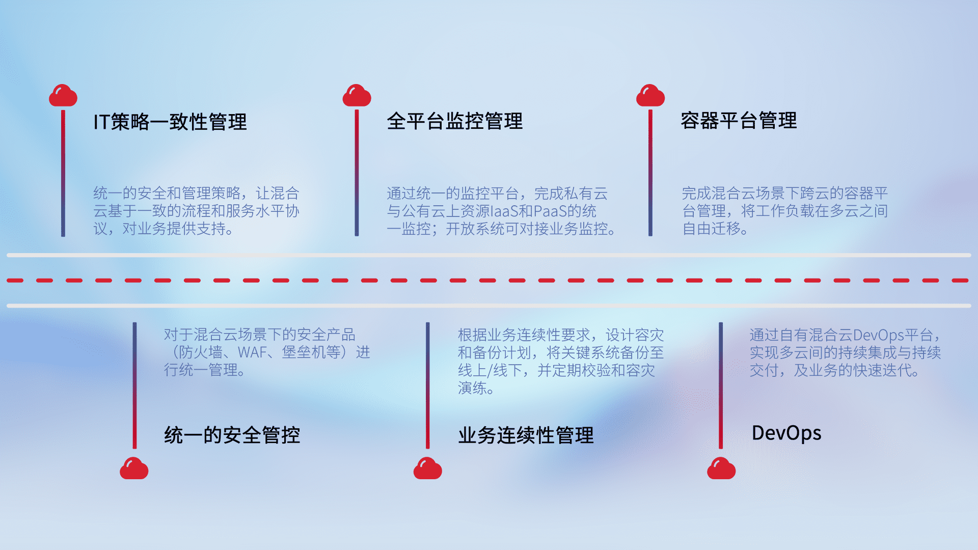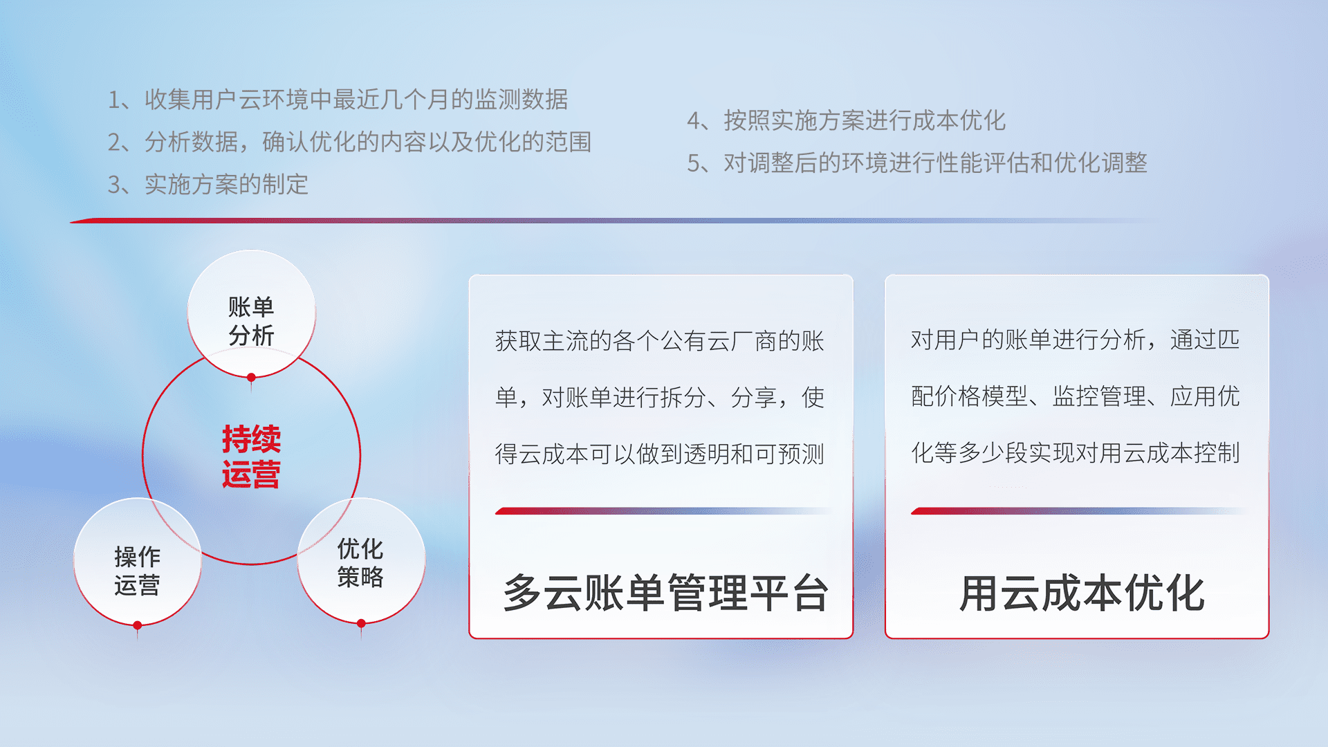 通过多云纳管,,,以统一的资源数据模型把客户的云资源进行抽象和封装,,进而实现对多云资源的统一操作,,保障云资源管理的可靠性、、、、稳定性与可用性。。量身定制化运维内容,,配置、、、、开发运维、、、补丁管理、、备份、、、监控、、、认证和访问管理、、审计和日常巡检等,,,,保障在用云过程中的可靠度,,稳定度以及高可用率。。